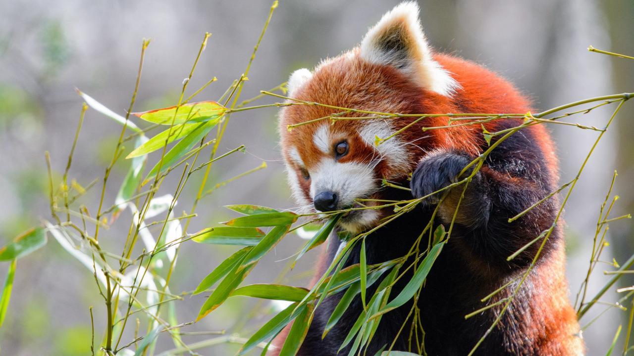Обои Малая панда грызет зеленые ветки бамбука