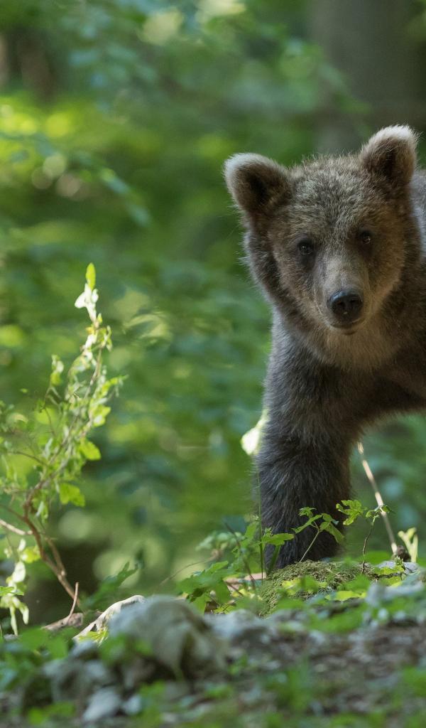 Обои Маленький бурый медведь идет по лесу