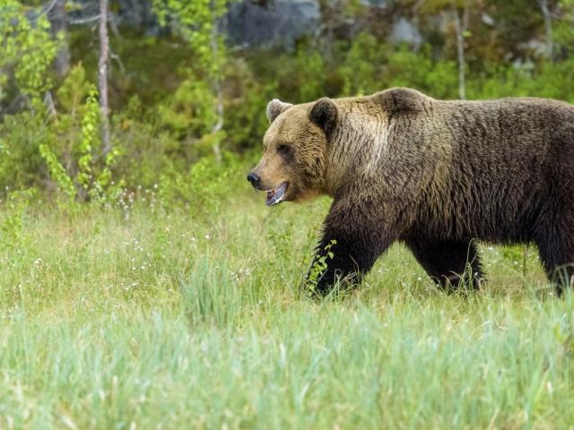 Обои Большой бурый медведь идет по зеленой траве в лесу