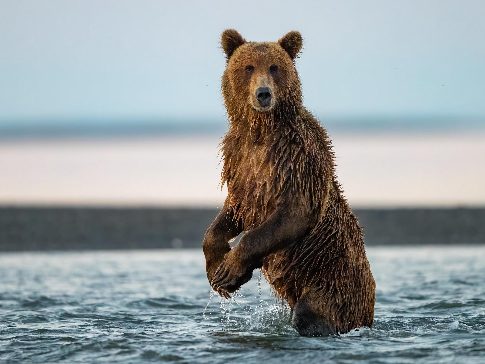 Обои Большой бурый медведь охотится в реке