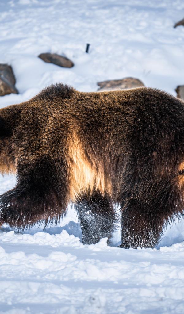 Обои Большой бурый медведь идет по белому снегу