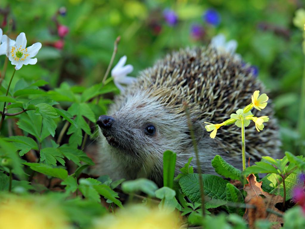 Обои Золотистый ретривер с высунутым языком стоит в сиреневых цветах
