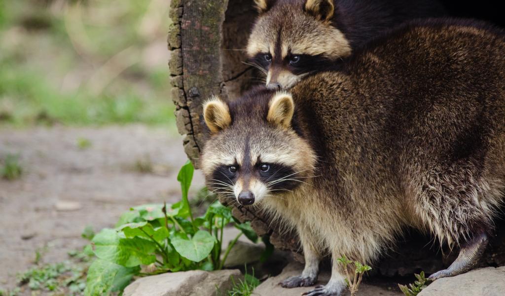 Обои Два забавных енота вылазят из дерева