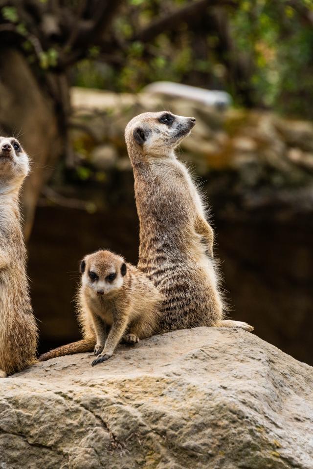 Обои Три суриката сурикаты на камне в зоопарке