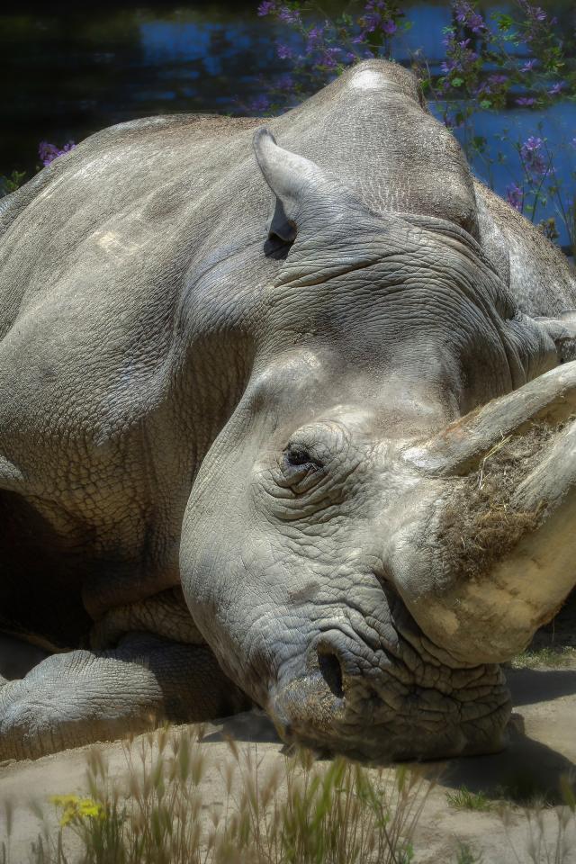 Обои Большой носорог лежит на земле у пруда
