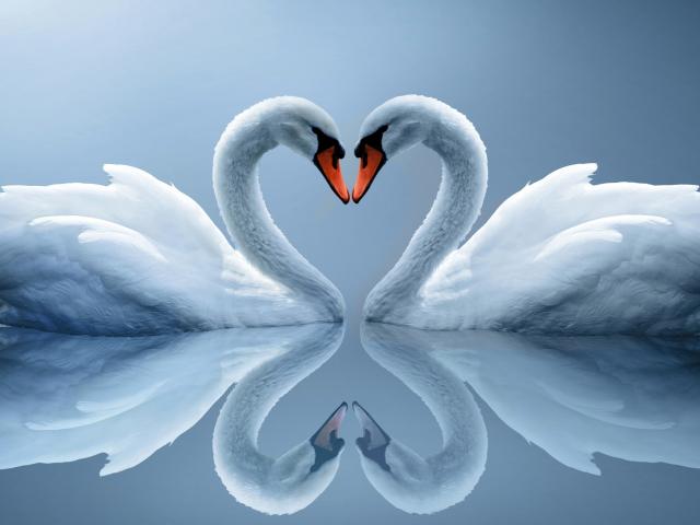 Обои Два влюбленных белых лебедя отражаются в воде