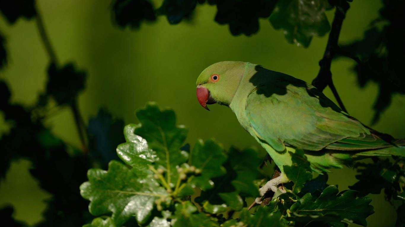 Обои Зеленый попугай с красным клювом сидит на ветке