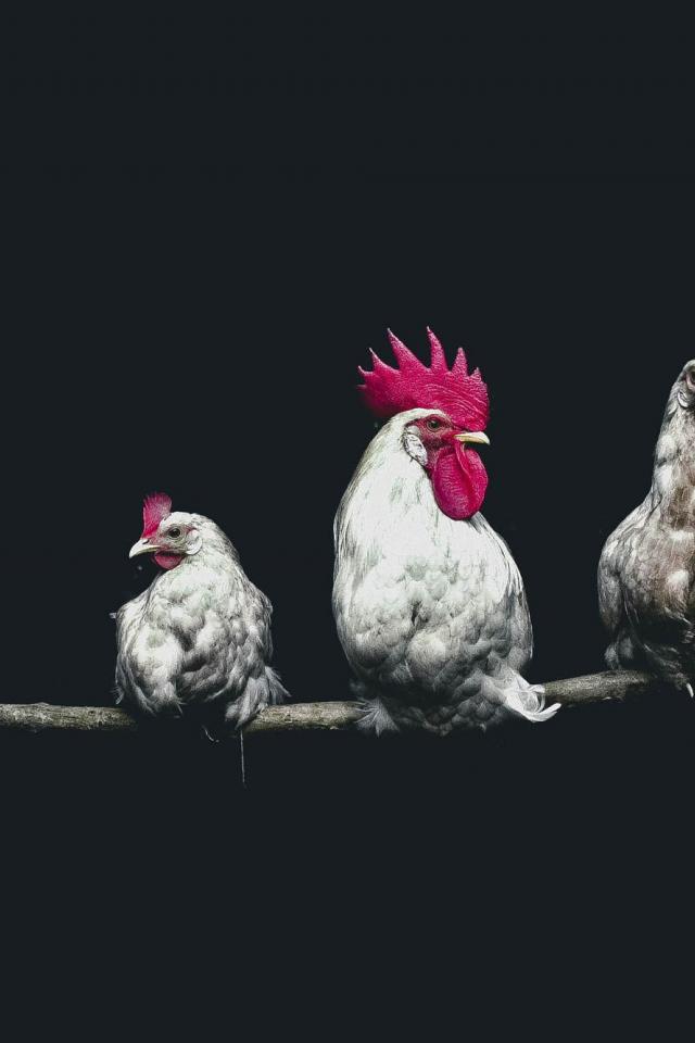 Обои Белый петух и две курицы на жердочке