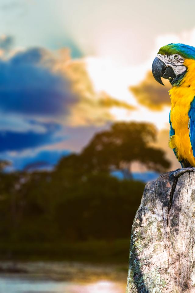 Обои Большой сине - желтый попугай ара сидит на сухом дереве