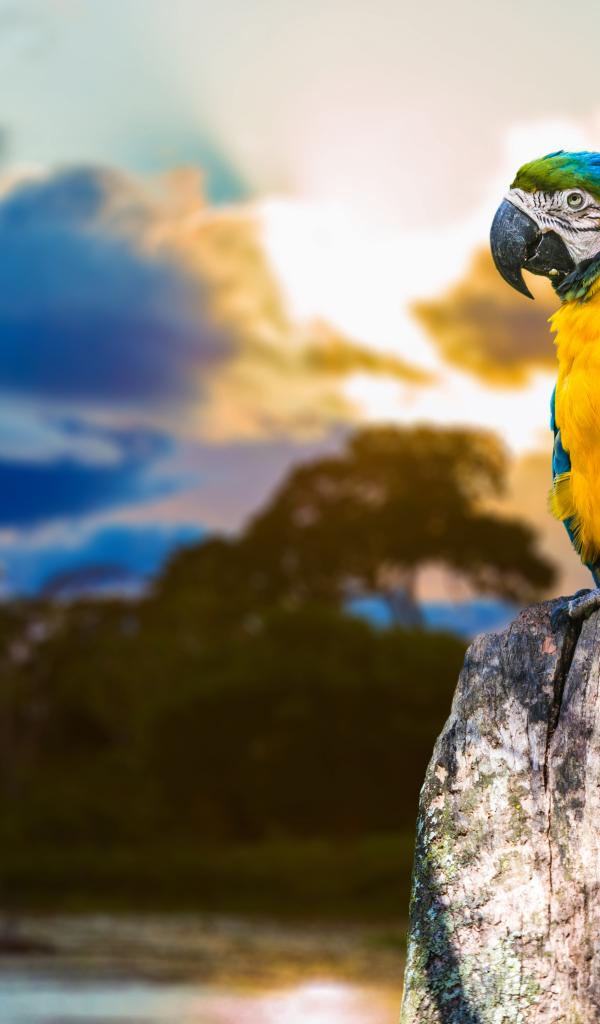 Обои Большой сине - желтый попугай ара сидит на сухом дереве