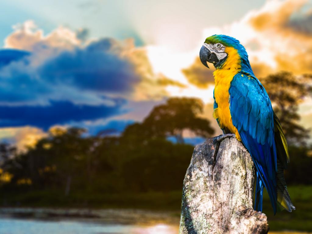 Обои Большой сине - желтый попугай ара сидит на сухом дереве