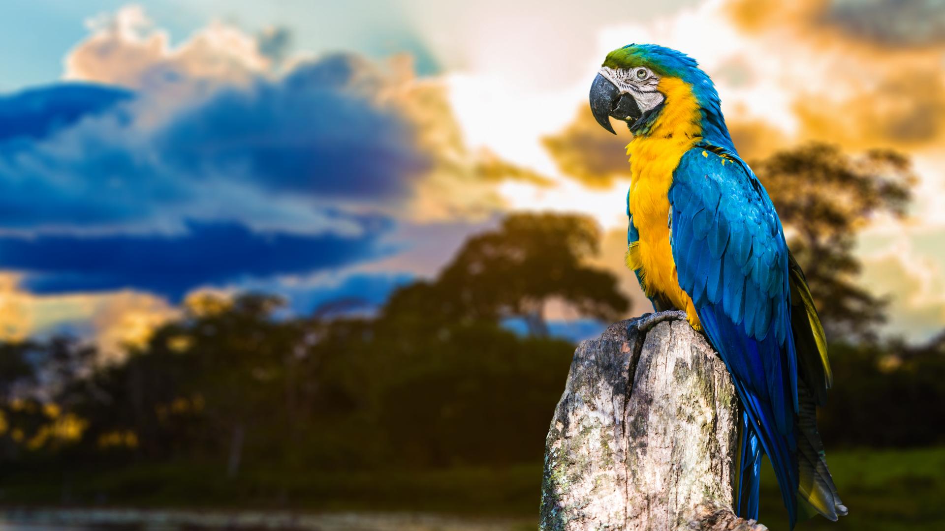 Обои Большой сине - желтый попугай ара сидит на сухом дереве