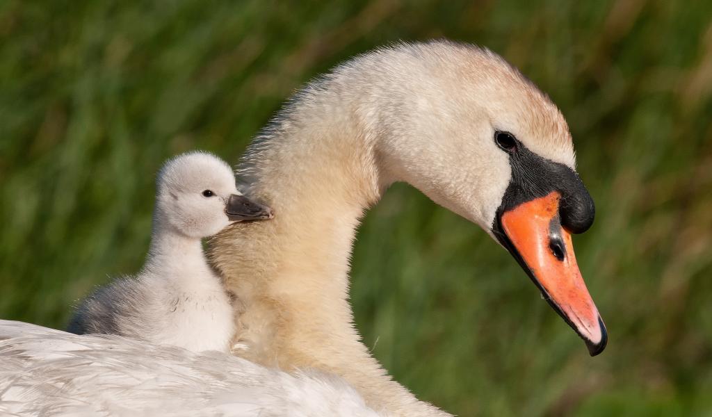 Обои Красивые белый лебедь шипун с маленьким птенцом