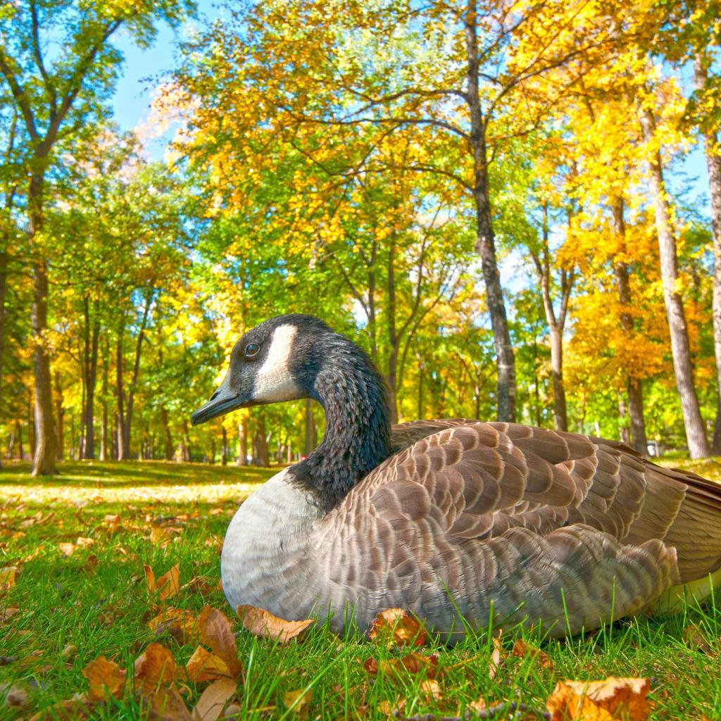 Обои Большой гусь сидит на траве в парке осенью