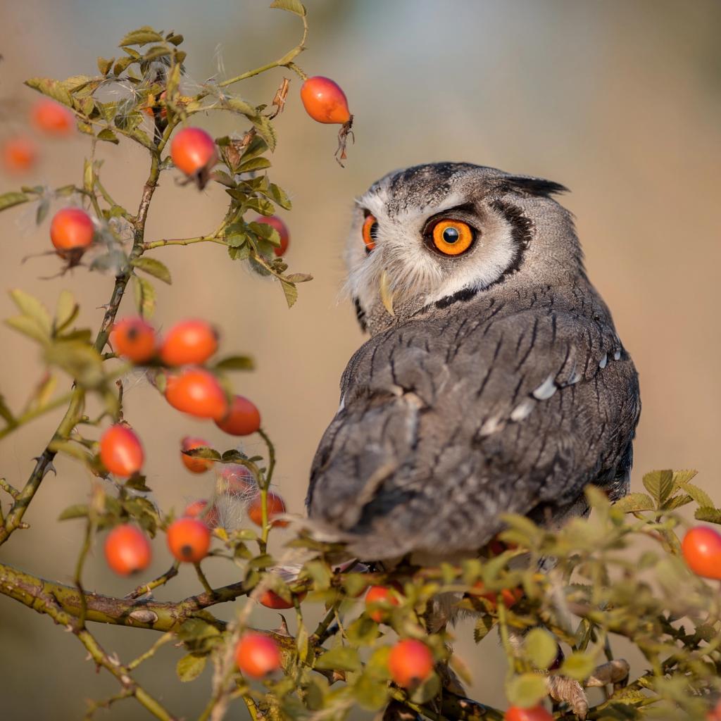 Обои Большая сова сидит на ветке с красными ягодами шиповника