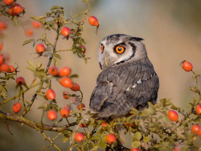 Обои Большая сова сидит на ветке с красными ягодами шиповника