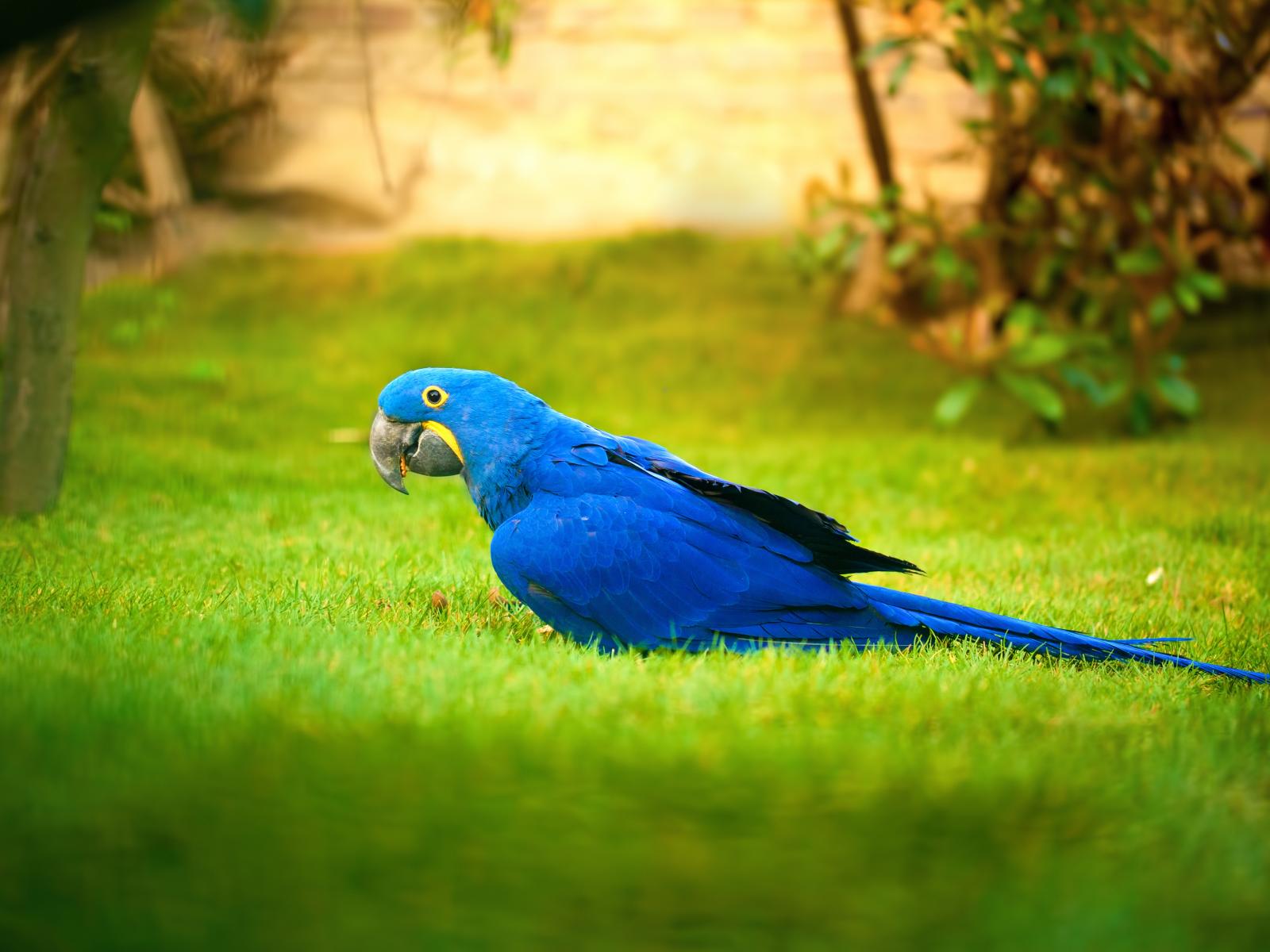 Обои Синий попугай ара гуляет по зеленой траве