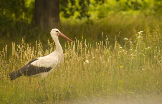 Обои Аист идет по зеленой высокой траве