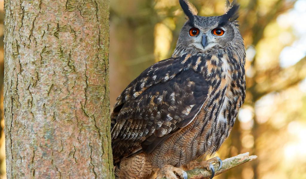 Обои Красивая большая сова с желтыми глазами сидит на ветке