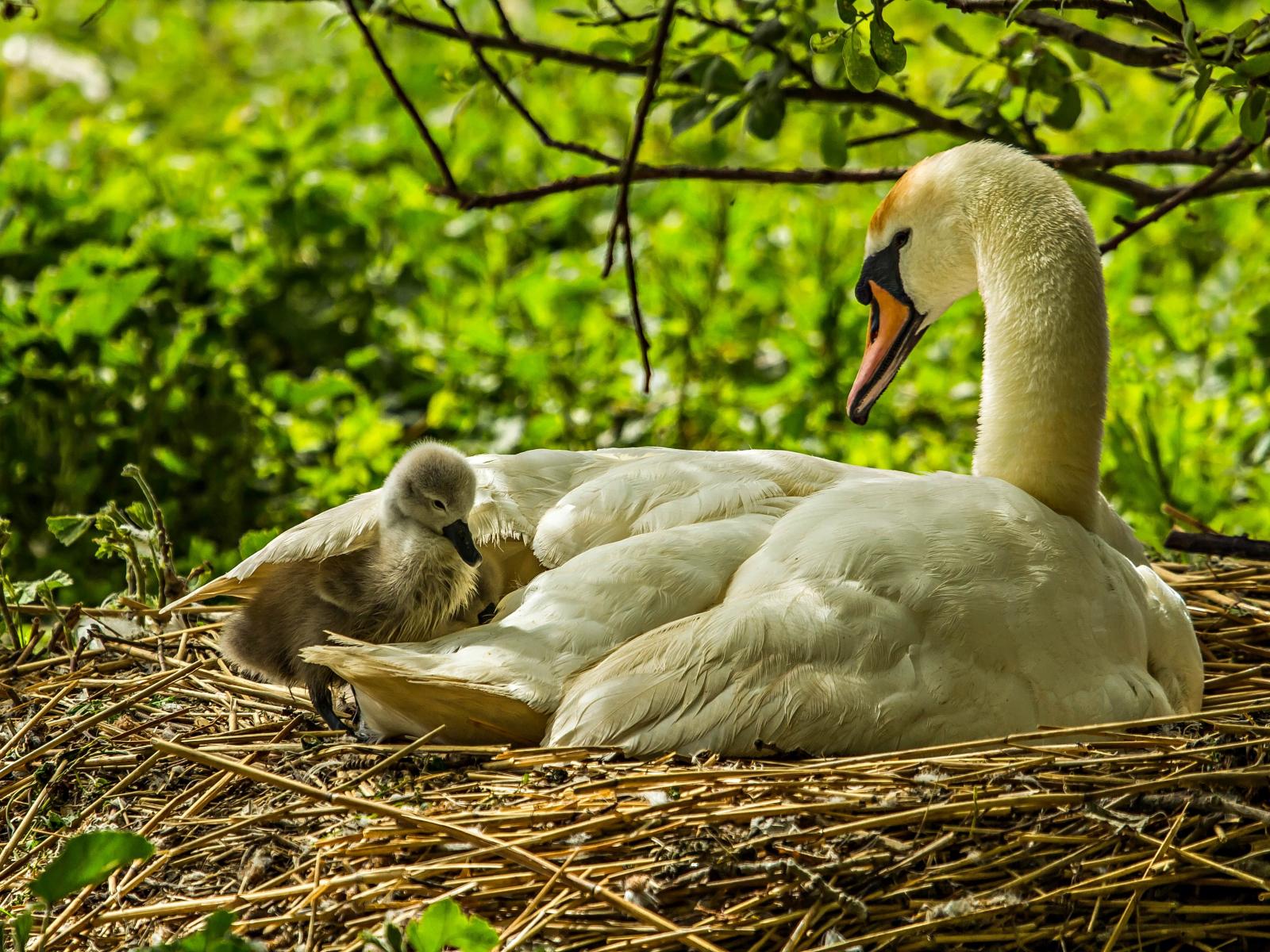 Обои Красивый белый лебедь с птенцами в гнезде