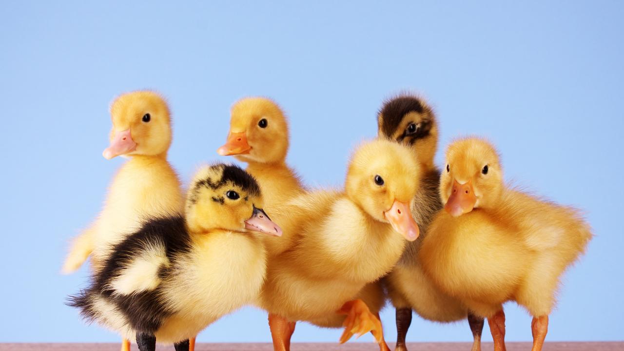 Обои Маленькие желтые утята на голубом фоне