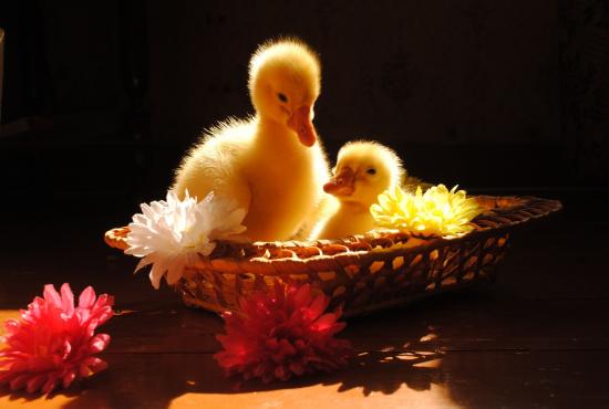 Обои Два желтых маленьких утенка сидят в корзинке