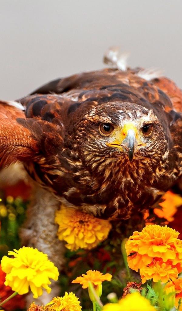 Обои Хищный ястреб сидит на цветах