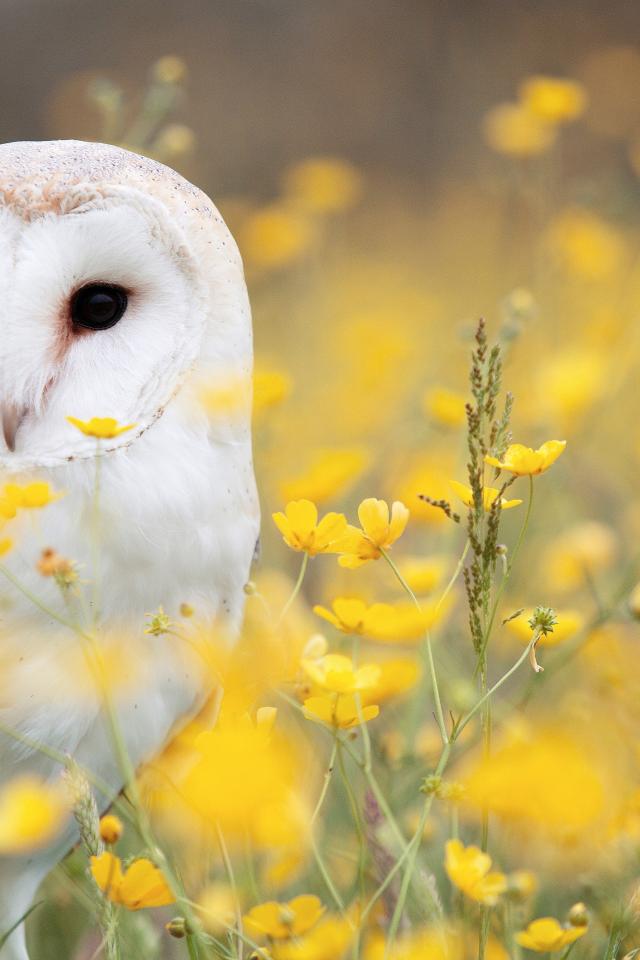 Обои Большая белая сова сидит в желтых цветах