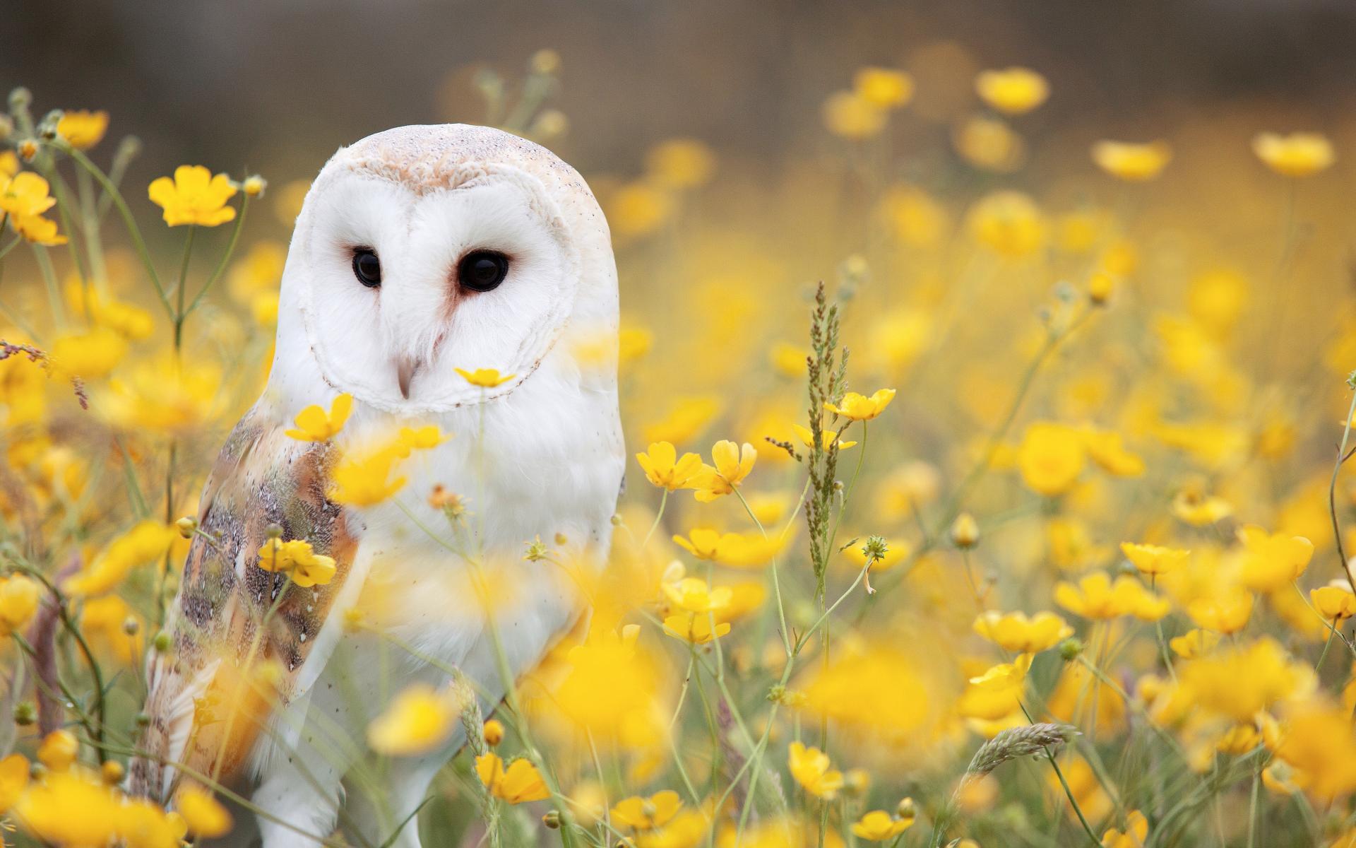 Обои Большая белая сова сидит в желтых цветах