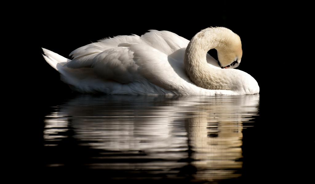 Обои Белый лебедь спрятал клюв в перья на черном фоне