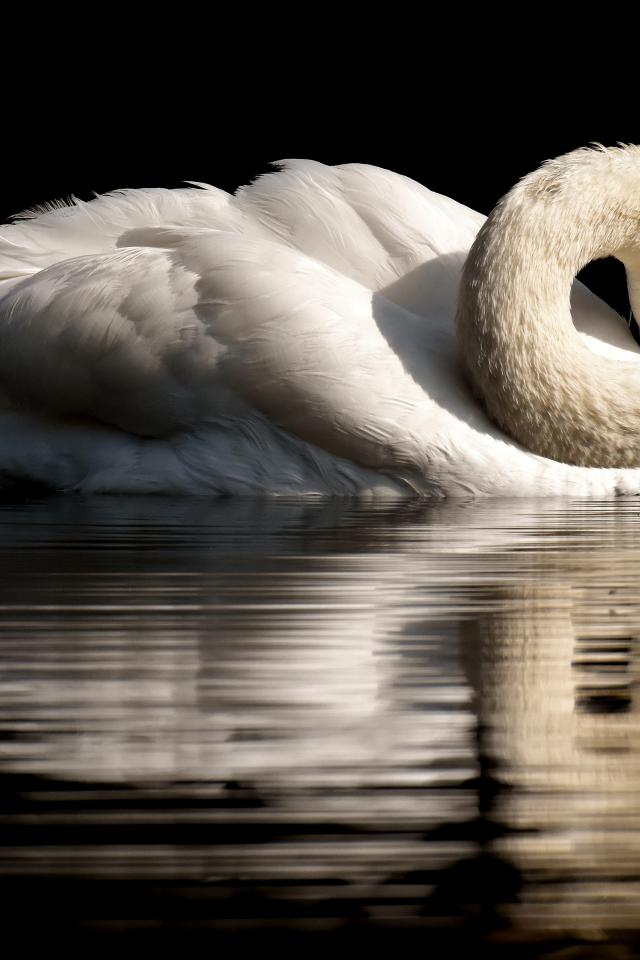 Обои Белый лебедь спрятал клюв в перья на черном фоне