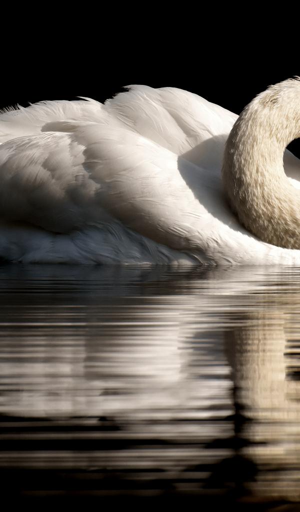 Обои Белый лебедь спрятал клюв в перья на черном фоне