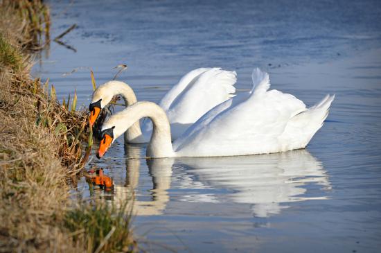 Обои Два красивых белых лебедя у берега
