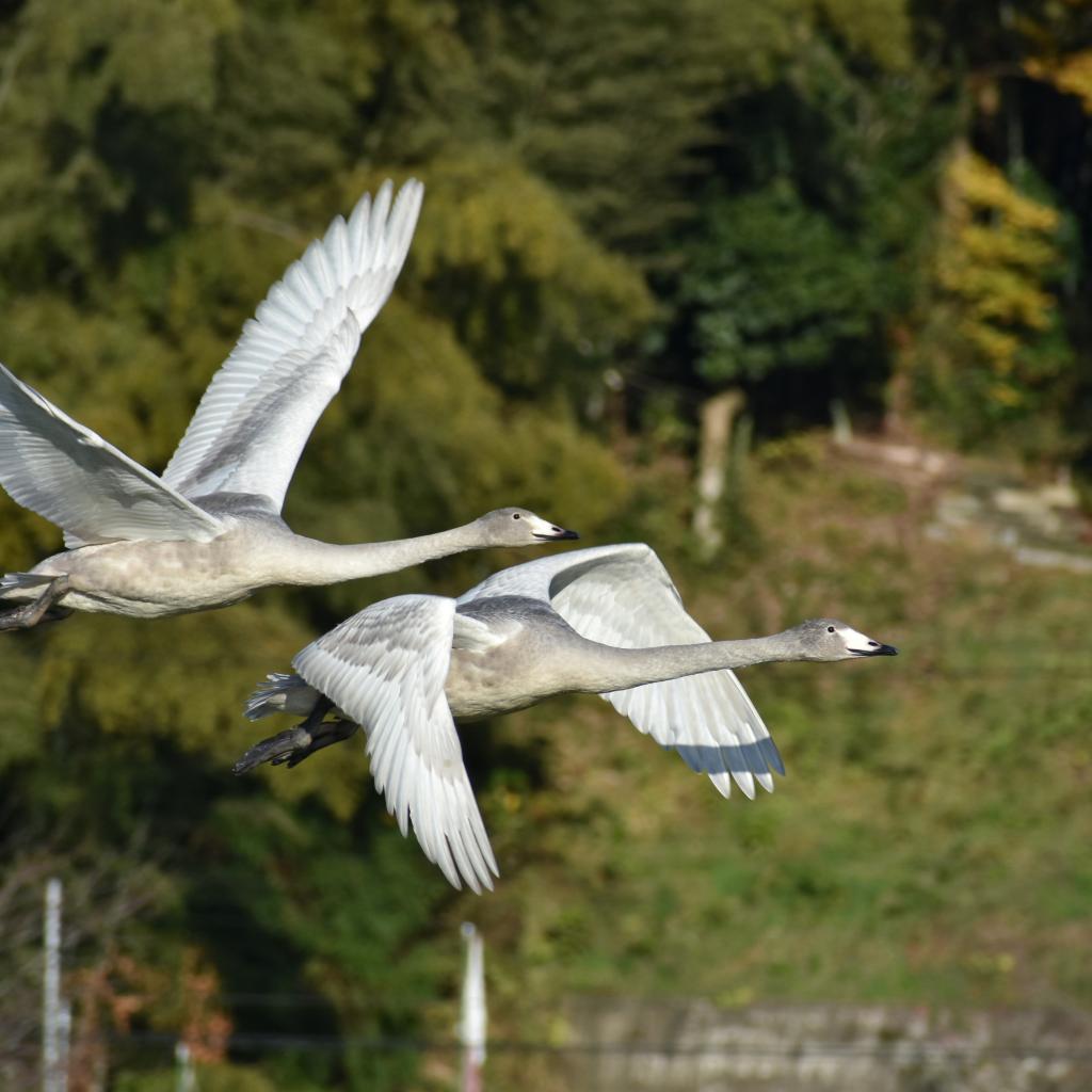 Обои Два серых диких гуся пролетают у дерева