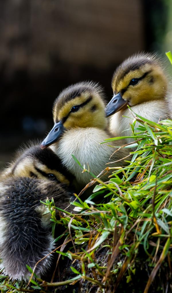 Обои Маленькие утята сидят на траве у пруда