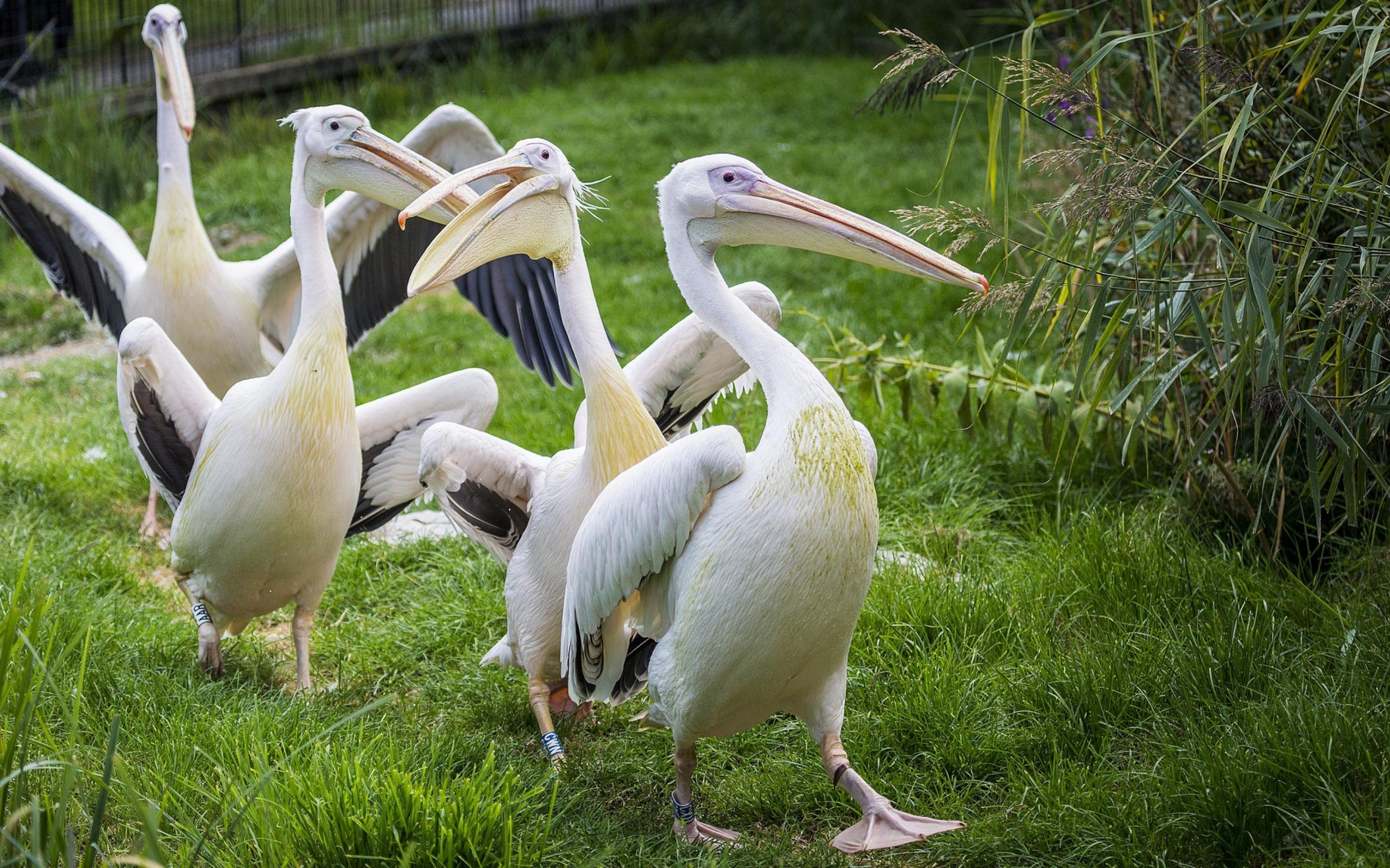 Обои Четыре пеликана идут по зеленой траве