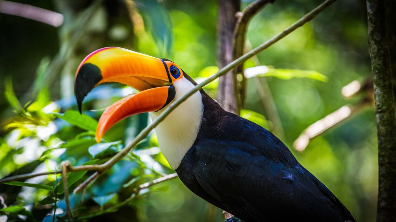 Обои Большой тукан с открытым клювом сидит на ветке
