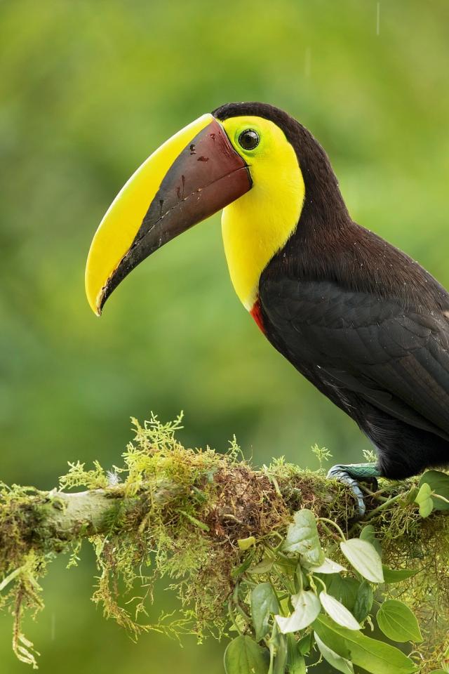 Обои Большой тукан сидит на ветке дерева под каплями дождя