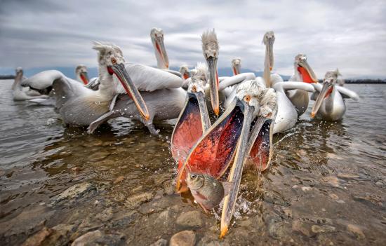 Обои Стая пелинанов ловят рыбу