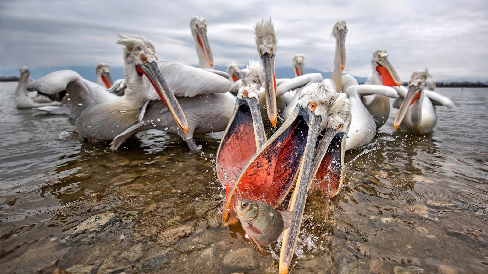 Обои Стая пелинанов ловят рыбу