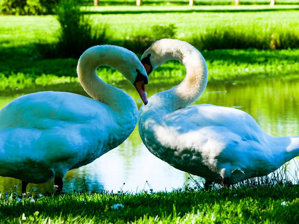 Обои Два красивых белых лебедя у пруда на зеленой траве