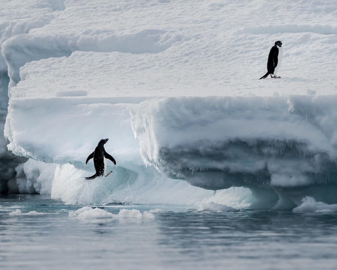 Обои Пингвины выпрыгивают на холодную льдину