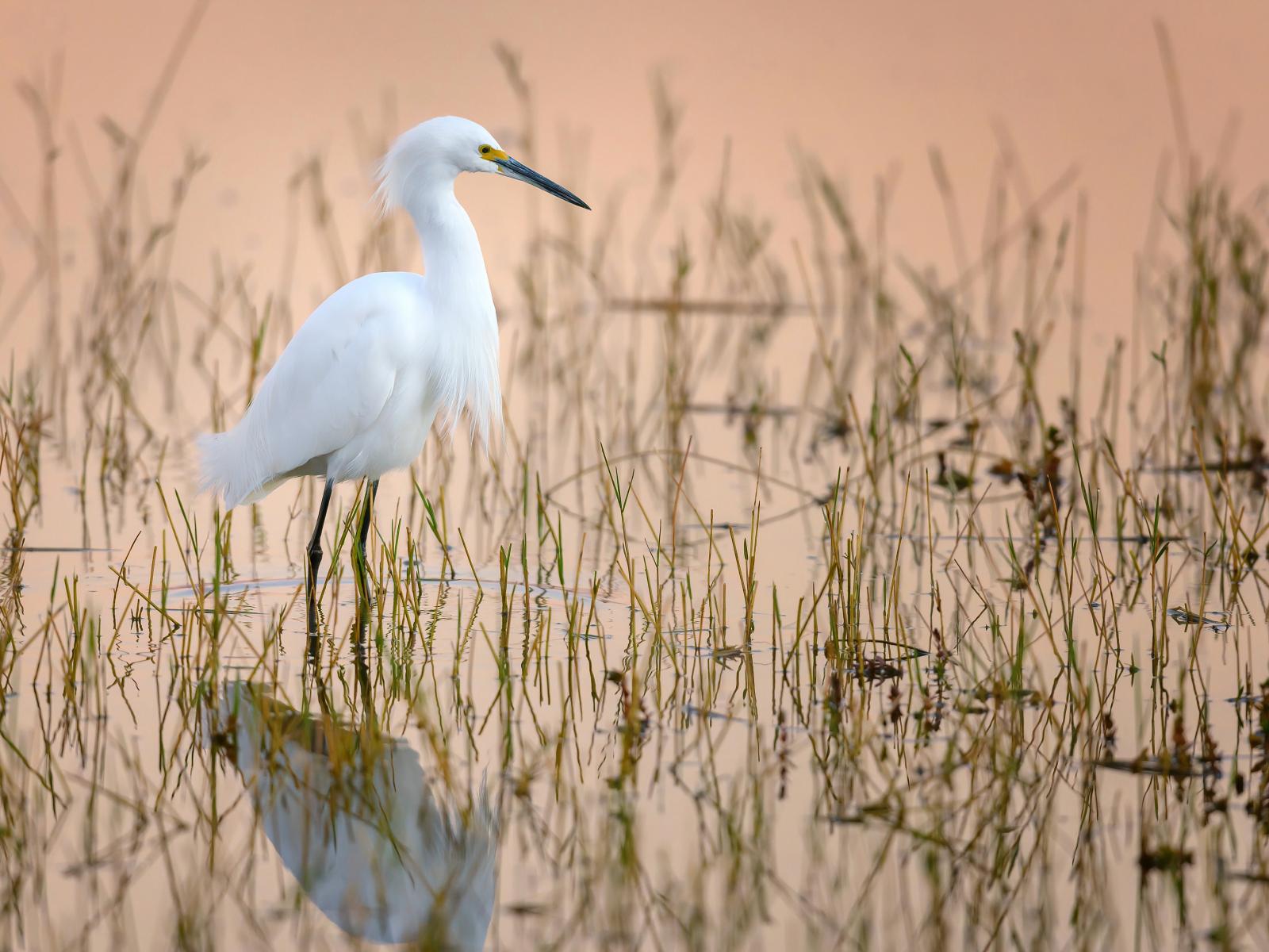 Обои Большая белая цапля в воде на охоте