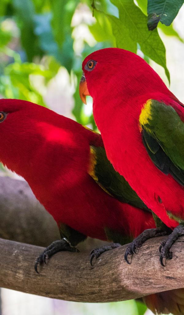 Обои Красные попугаи сидят на ветке под зелеными листьями