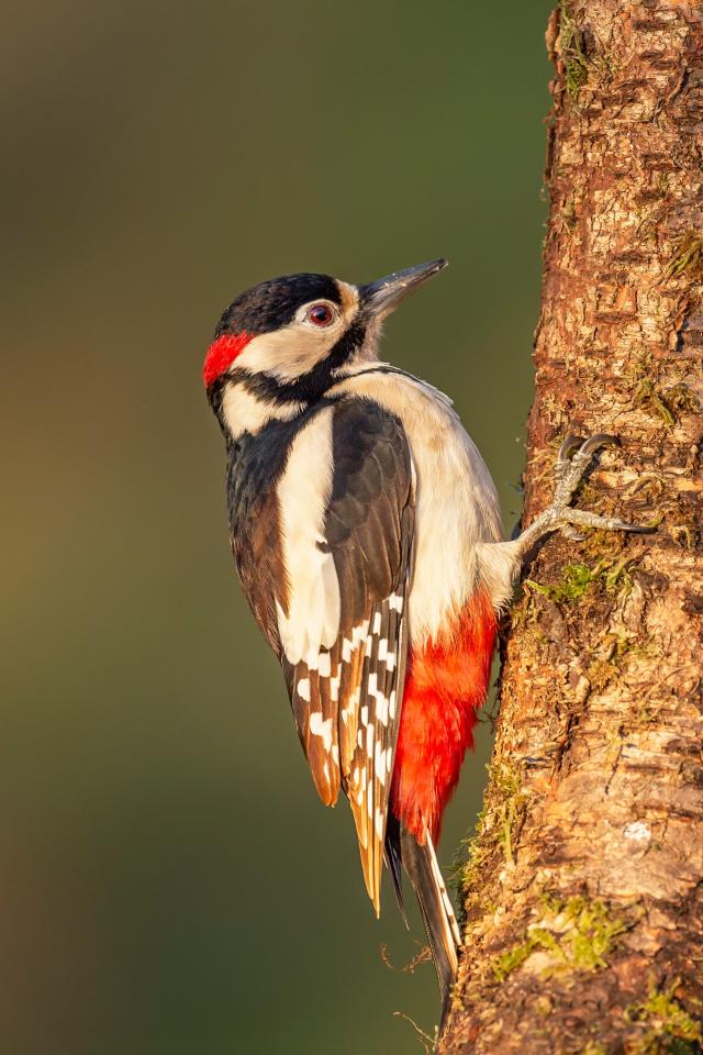 Обои Большой дятел сидит на покрытом мхом дереве