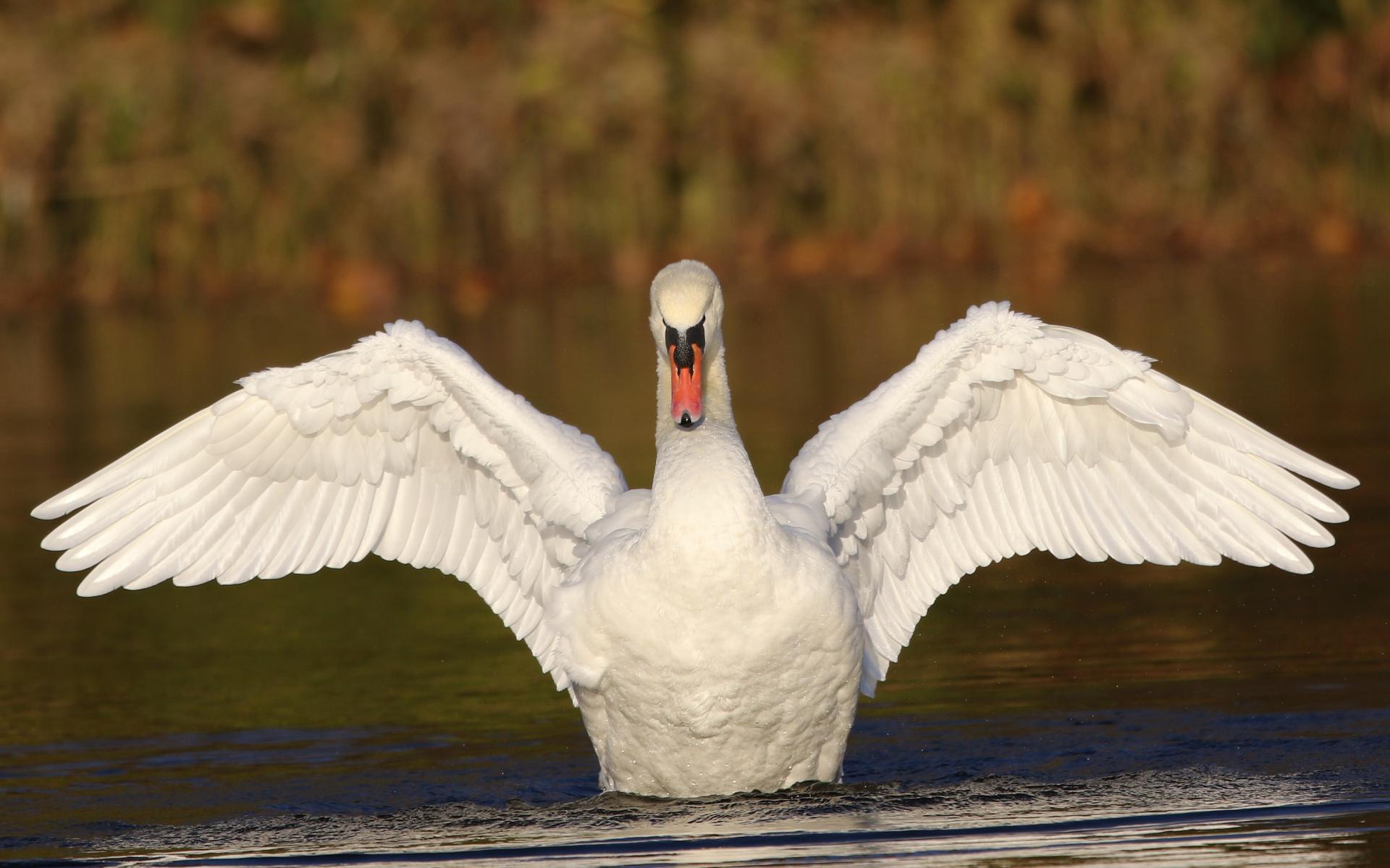 Обои Красивый белый лебедь расправил крылья в пруду