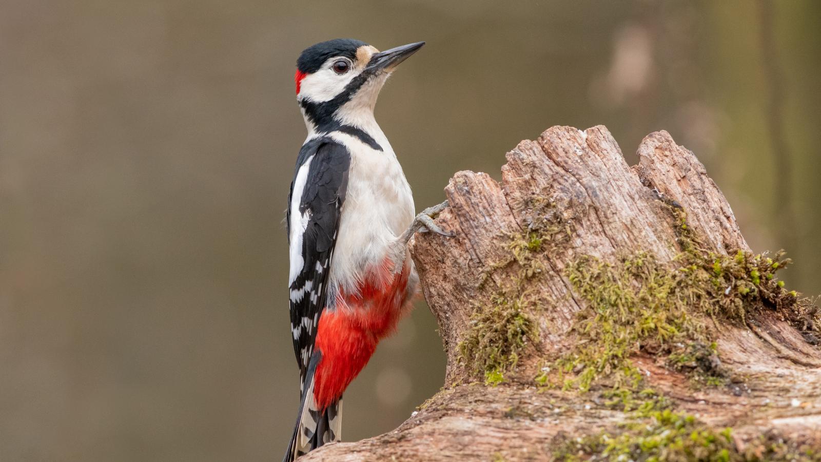 Обои Большой пестрый дятел сидит на сухом дереве