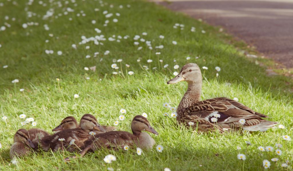Обои Серая утка с утятами на зеленой траве с белыми ромашками