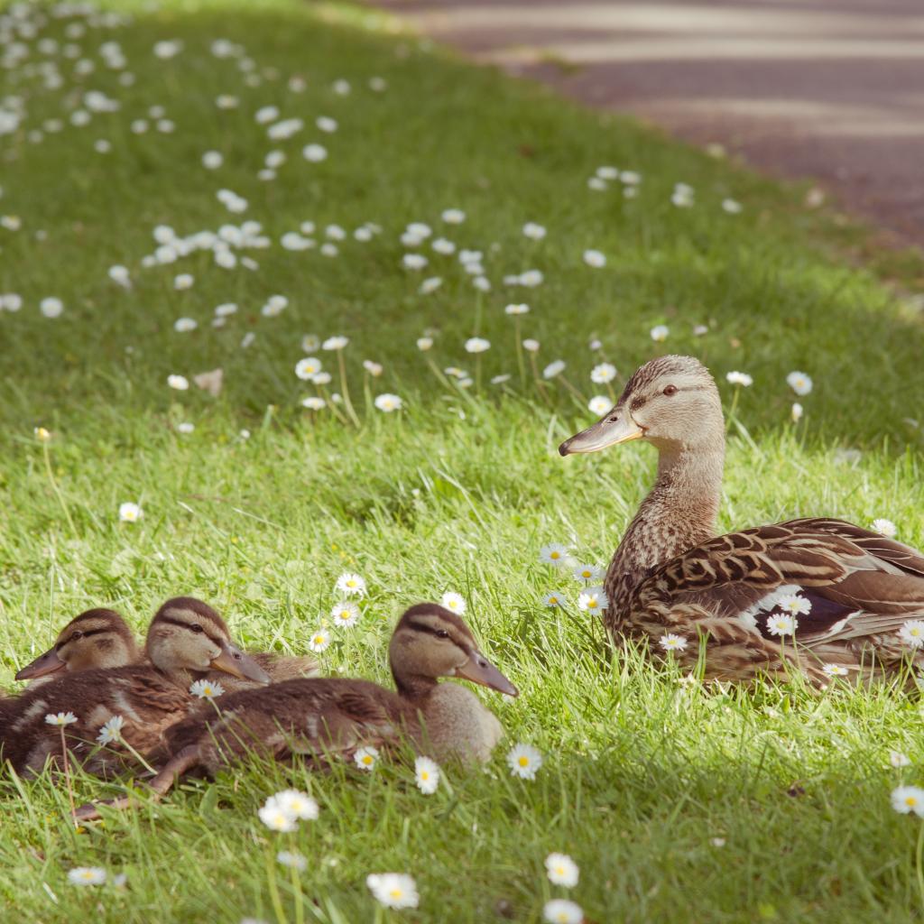 Обои Серая утка с утятами на зеленой траве с белыми ромашками