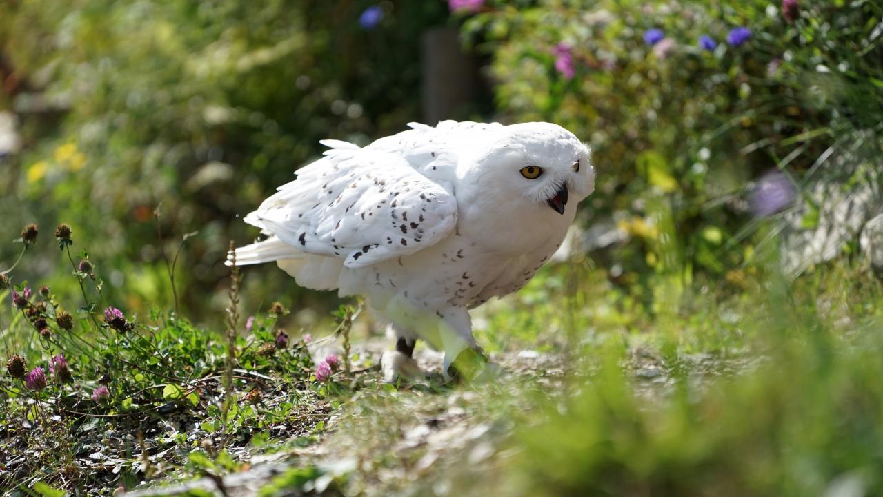 Обои Большая белая сова крадется в траве